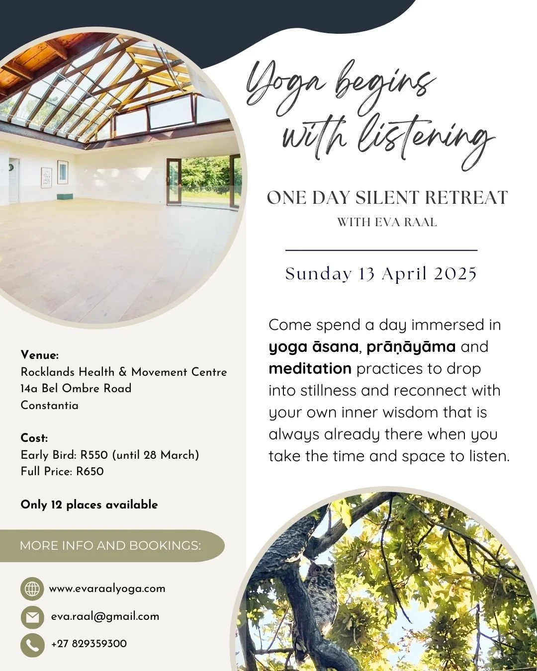 My next retreat will take place on Sunday 13 April 2025 at the Rocklands Health and Movement centre in the leafy suburb of Constantia.